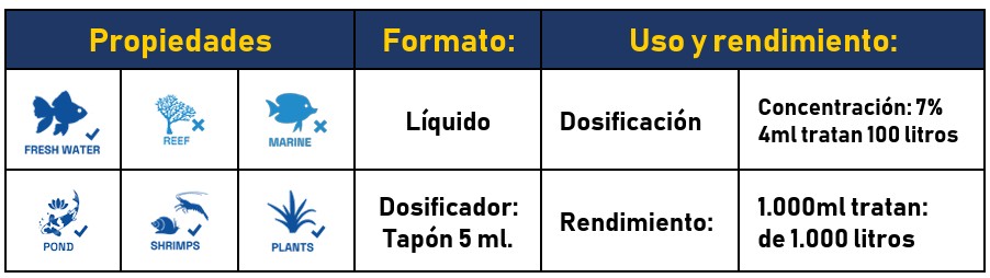 - Rendimiento: 4 ml tratan 100 L de agua · 1000 ml tratan hasta 1000 L de acuario