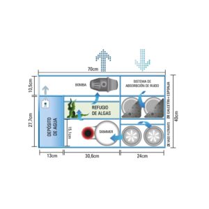El sump ha sido diseñado para aprovechar al máximo el espacio, una pequeña urna compacta divida en diversos compartimentos con los últimos avances en filtración y reducción de ruidos:
