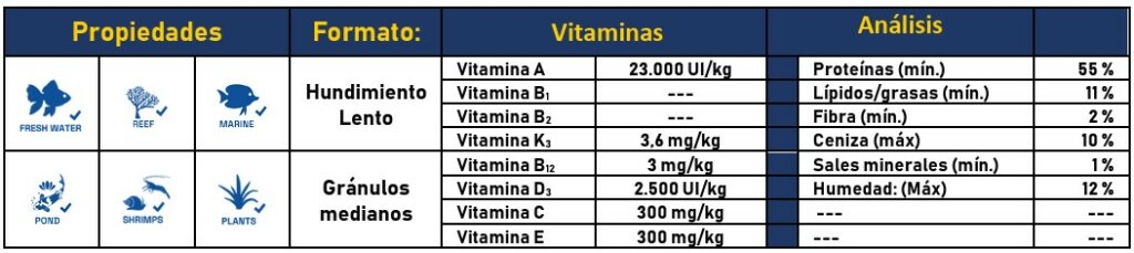 ✔ Gránulos de hundimiento lento que permiten la alimentación en todas las zonas del acuario.