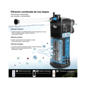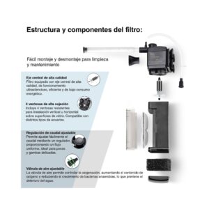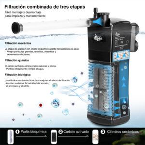 - Filtro interior super compacto con capacidad para filtración mecánica, química y biológica.