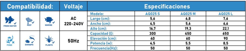 - S: Caudal 300 l/h, para acuarios de 19-38 Litros, medida 5,6 x 4,5 x 16,7 cm