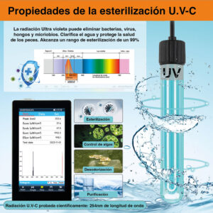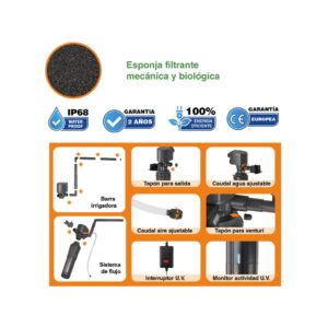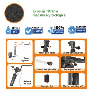 - Filtro para acuarios 4 en 1: desinfección con tecnología UV-C de 253,7 nm, filtración mecánica, circulación y oxigenación.