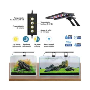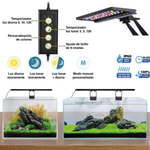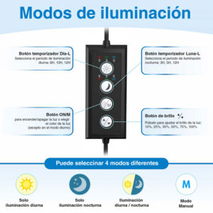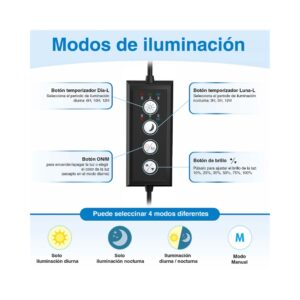 Cuenta con un avanzado temporizador dual Día-Noche, con funciones automáticas para amanecer, día, atardecer y luz lunar, permitiendo 9 opciones de color ajustables. Dispone de 6 niveles de brillo regulables (10%, 25%, 35%, 50%, 75% y 100%) y 4 modos de iluminación fácilmente configurables desde su mando incluido.