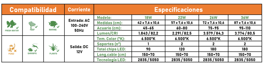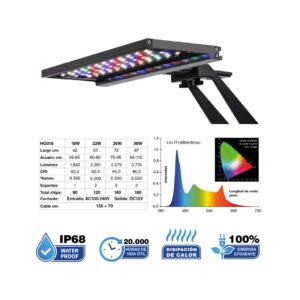 Su carcasa de aluminio asegura una disipación eficaz del calor, prolongando la vida útil del producto hasta 50.000 horas. La instalación es sencilla gracias a sus soportes extensibles adaptables a acuarios de 45 a 110 cm de largo