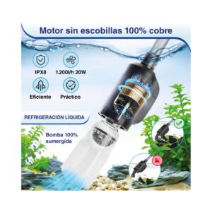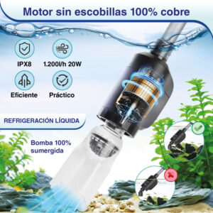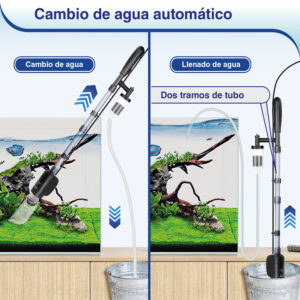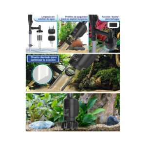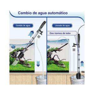 - Aspiración potente: La bomba de agua ofrece un flujo de agua potente, lo cual permite cambios de agua rápidos y eficientes y la retirada de residuos y desperdicios de peces del acuario.