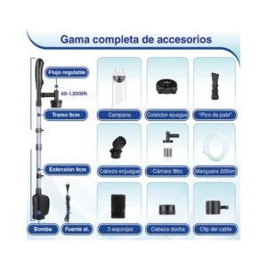 - Cuenta con una manguera de 2 metros y cuatro complementos para realizar diversas labores de limpieza del acuario.
