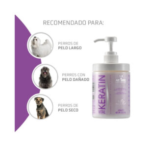 - La queratina actúa sobre la piel y el pelo, regenera el pelo dañado aportando un bonito aspecto sedoso en el manto