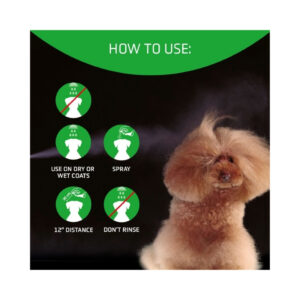 - Acondicionador para perros multifase en spray en pelo mojado o seco y sin aclarado. Eliminador de enredos. Capacidad de mantener el pelo libre de enredos por más tiempo.