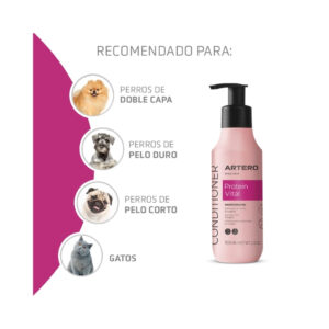 - El acondicionador Artero Protein Vital está destinado, principalmente, a perros de pelo duro, mantos densos de doble capa, pelo corto, con rulos y gatos.