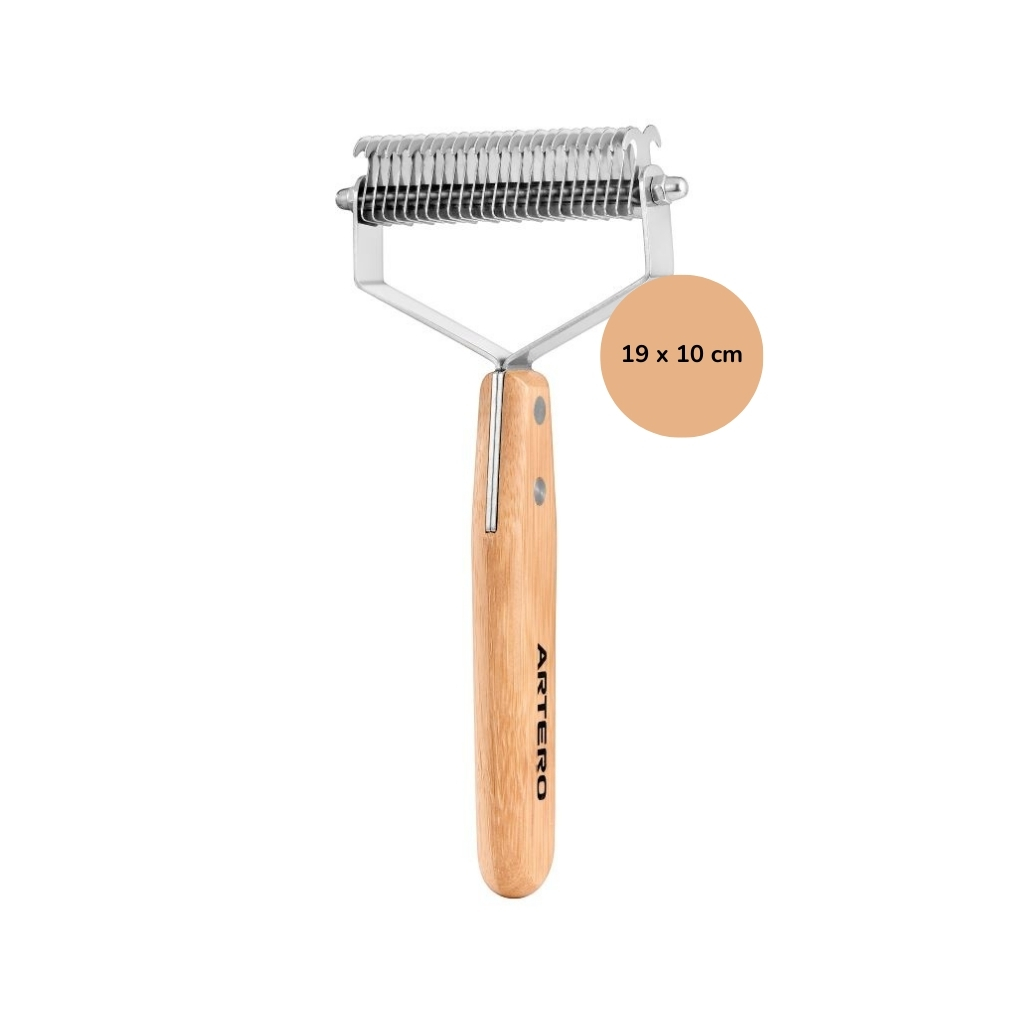 - Deslanador para perros que cuenta con cuchillas dobles en la parte superior. Por un lado, presenta 13 hojas, que sirven para peinar y abrir el manto. En el otro lado, tiene 25 hojas, que se utilizan para eliminar enredos, nudos y el pelo de muda.