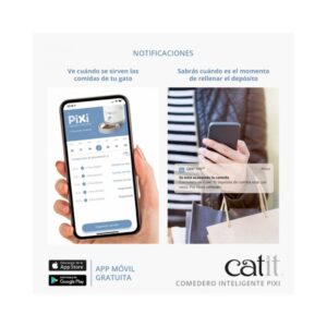 Puede controlarse mediante una aplicación móbil gratuita desarrollada especialmente para monitorizar los productos inteligentes Catit. Con esta práctica aplicación se pueden controlar muchas funciones de este comedero inteligente para gatos, de forma remota, y compartir el acceso directamente con familiares o amigos.