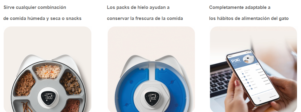 Con la aplicación gratuita Catit PIXI se podrán programar las comidas diarias de un gato, ya sea de dieta seca, solo con pienso, dieta híbrida entre seca y húmeda, o dieta Barf. Además se puede añadir en algunos compartimentos todo tipo de snacks secos o húmedos, para que los gatos disfruten todavía más.