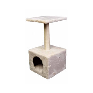 - Rascador para gato que combina un escondite en forma de cubo que tiene en su parte superior un poste de sisal para rascar y una plataforma de descanso.