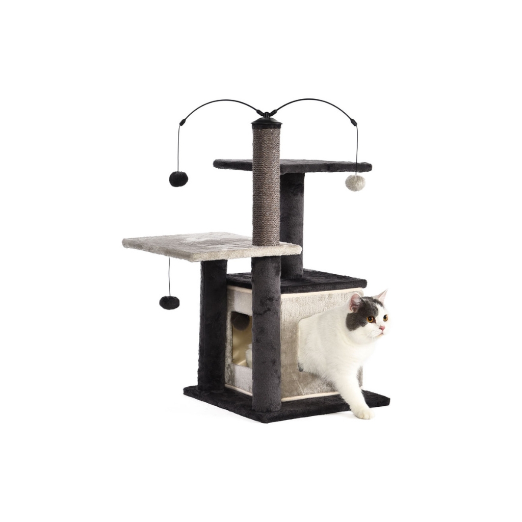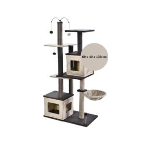 - Puede montarse de forma conjunta, consiguiendo un mueble con 2 cubos para esconderse, una hamaca para el descanso, varias plataformas y varias pelotas para activar el juego además de robustos cilindros de sisal para afilar las uñas de los gatos o bien puede estar también dividido en 3 trepadores más pequeños, ideal para colocarlos en distintas habitaciones/hogares o si disponemos de varios gatos.