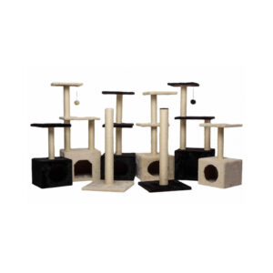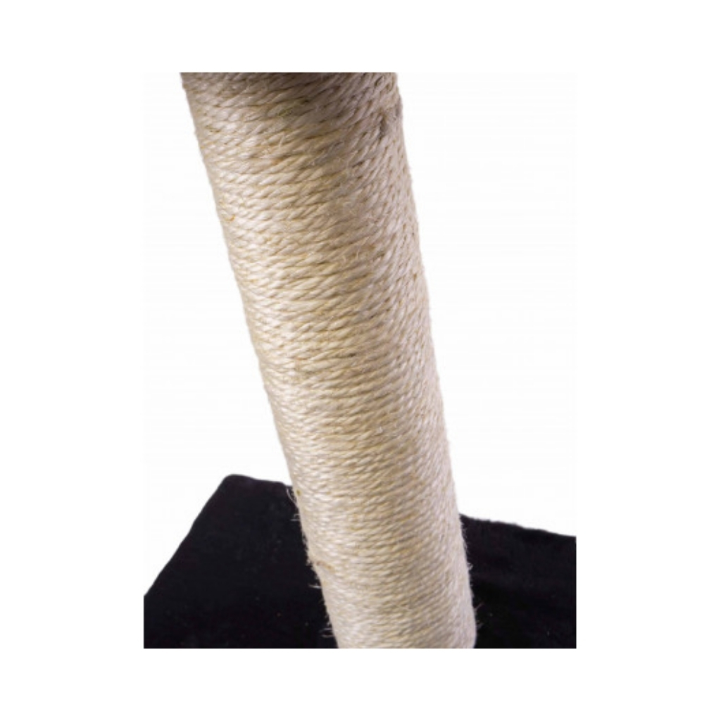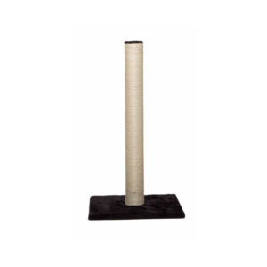 Rascador para gato formado por un poste de sisal sobre una plataforma.