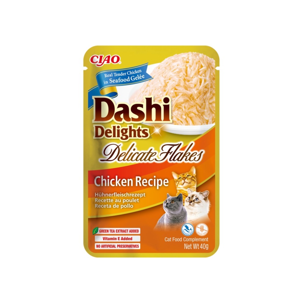 - Alimento húmedo complementario elaborado con tiras finas de pollo en un caldo Dashi a base de vieira, de textura suave y altamente apetecible.