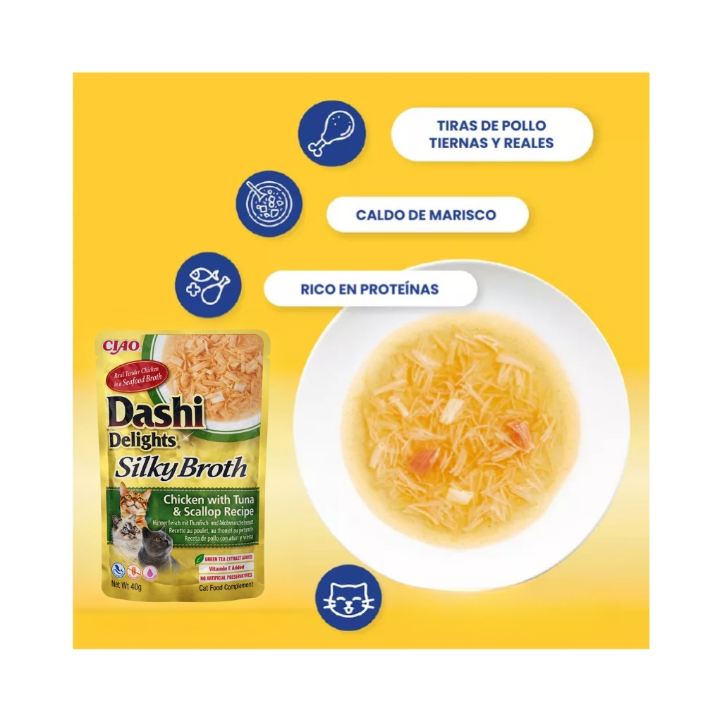 - Indicado como complemento alimentario para gatos adultos que necesitan un extra de hidratación, variedad en la dieta o un alimento altamente apetecible.