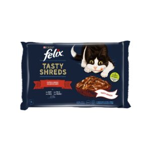 Felix Tasty Shreds son tiernos e irresistibles trozos desmenuzados en una sabrosa salsa que le encantará a tu gato. ¡Se ven, huelen y saben deliciosos, como comida que podrías haber cocinado tú mismo!
