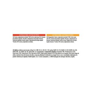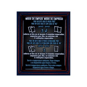 - Para un gato adulto medio (4kg), servir 4 sobres al día en al menos 2 comidas separadas.