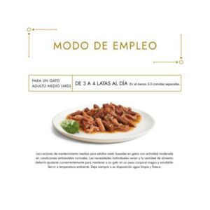 - Para un gato adulto medio (4kg) servir 4 latas al día en al menos 2 comidas separadas.