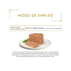 - Para un gato adulto medio (4kg) servir 4 latas al día en al menos 2 comidas separadas.