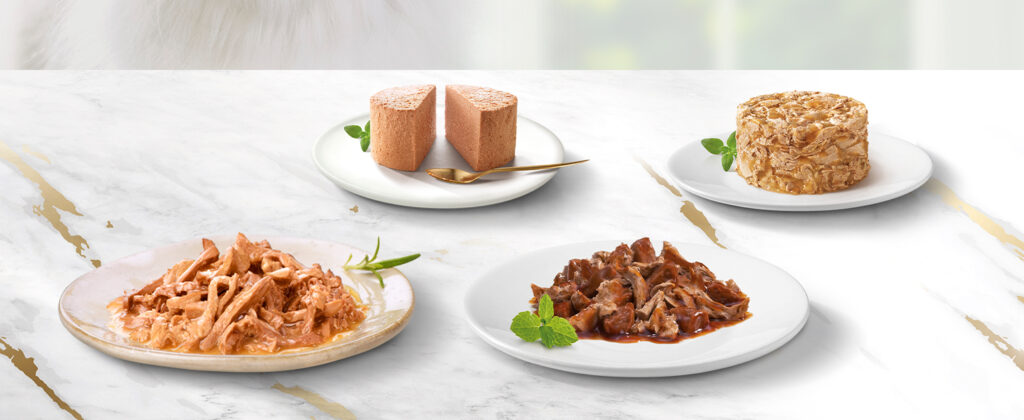 - Suaves mousses con carnes o pescados preparadas cuidadosamente para ofrecer a tu gato el placer de una delicada y suave sensación.