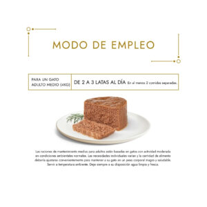 - Para un gato adulto medio (4kg) servir 4 latas al día en al menos 2 comidas separadas.