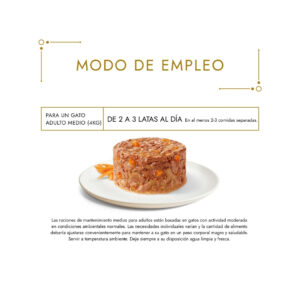- Para un gato adulto medio (4kg) servir 4 latas al día en al menos 2 comidas separadas.