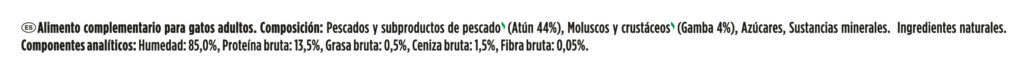 Alimento complementario para gatos Adultos. Rico en láminas de Atún con Gambas en Gelatina.