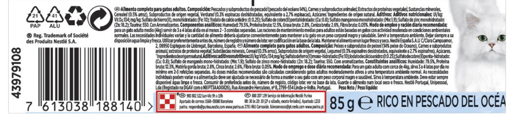 - Para un gato adulto medio (4kg) servir 4 latas al día en al menos 2 comidas separadas.