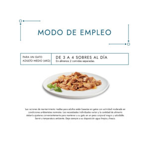 - Para un gato adulto medio (4kg), servir de 3 a 4 sobres al día en al menos 2 comidas separadas.