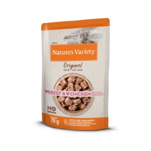 Alimento completo y equilibrado para gatos adultos, sin cereales. Con pollo y buey de alta calidad como ingrediente principal. Cocido al vapor a temperatura óptima en sus propios jugos para preservar mejor los nutrientes.