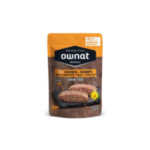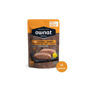Pollo (55%), caldo (28,7%), langostinos (15%), minerales, aceite de salmón, diente de león (0,1%).
