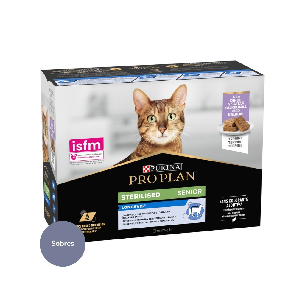 Alimento húmedo completo para gatos esterilizados de 7 años en adelante con Longevis que ha demostrado que prolonga una vida saludable y mejora la calidad de vida.