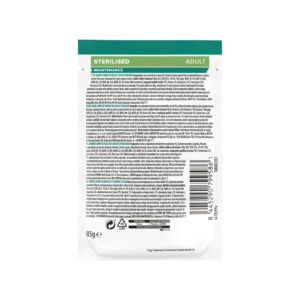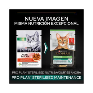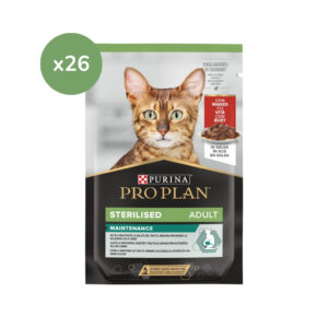 Sterilised Maintenance Adult con buey en salsa es un alimento húmedo completo para gatos adultos esterilizados para mantener un peso corporal saludable.