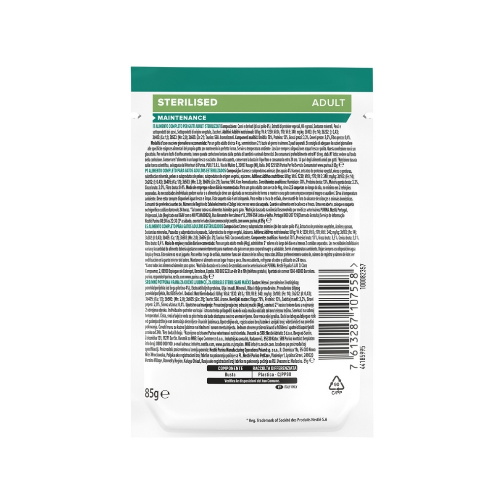 - Para un gato adulto esterilizado de 4 kg, administrar 2½ sobres diarios, repartidos en al menos 2 comidas.