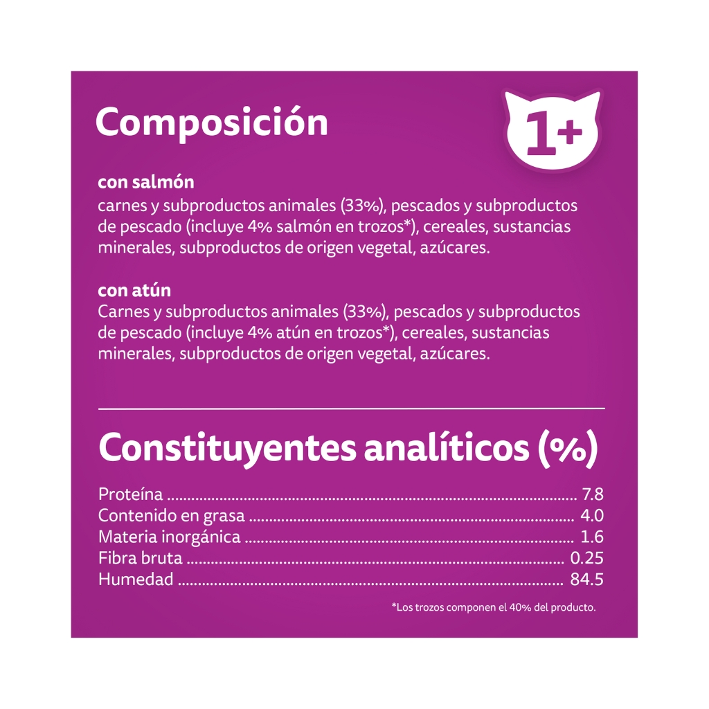 Carnes y subproductos animales (33%), pescados y subproductos de pescado (incluye 4% salmón en trozos*), cereales, sustancias minerales, subproductos de origen vegetal, azúcares. *Los trozos componen el 40% del producto. Composición: carnes y subproductos animales (33%), pescados y subproductos de pescado (incluye 4% atún en trozos*), cereales, sustancias minerales, subproductos de origen vegetal, azúcares. *Los trozos componen el 40% del producto. Composición: carnes y subproductos animales (33%), pescados y subproductos de pescado (incluye 4% pescado blanco en trozos*), cereales, sustancias minerales, subproductos de origen vegetal, azúcares. *Los trozos componen el 40% del producto. Composición: carnes y subproductos animales (33%), pescados y subproductos de pescado (incluye 4% bacalao en trozos*), cereales, sustancias minerales, subproductos de origen vegetal, azúcares. *Los trozos componen el 40% del producto