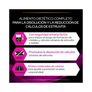 - Con seguridad urinaria St/Ox para reducir el riesgo de formación de cristales y cálculos urinarios de estruvita y oxalato