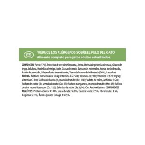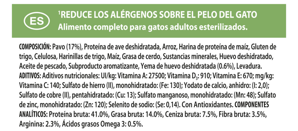 - Excelente nutrición para tu gato, con una fórmula innovadora que reduce los alérgenos sobre el pelo del gato gracias a una proteína específica obtenida de huevos. Los alérgenos se reducen una media del 47% a partir de las 3 semanas de alimentación continua*