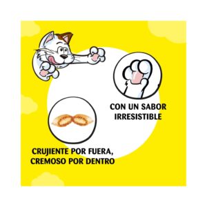 - Nuestros premios para gatos Catisfactions tienen doble textura, crujientes por fuera e increíblemente cremosos por dentro. Irresistibles para tu gato.