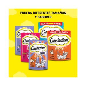 Los gatos se vuelven locos por el irresistible sabor de los premios Catisfactions. Deliciosamente crujientes por fuera y suaves por dentro; los gatos no pueden resistirse al delicioso sabor de Catisfactions. Así que, agita la bolsita y observa como tu gato viene corriendo.