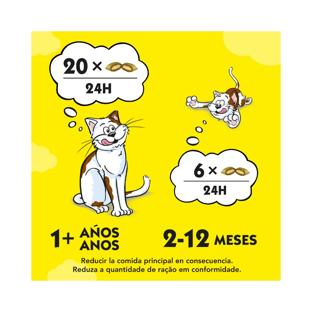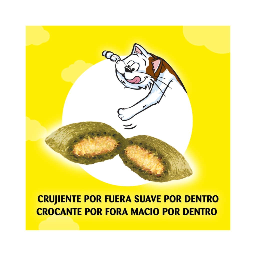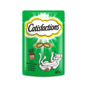- Nuestros premios para gatos Catisfactions tienen doble textura, crujientes por fuera e increíblemente cremosos por dentro. Irresistibles para tu gato.