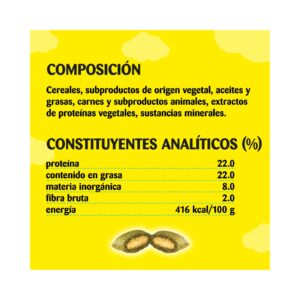 - Componentes Analíticos: Constituyentes analíticos (%): proteína: 22.0; contenido en grasa: 22.0; materia inorgánica: 8.0; fibra bruta: 2.0; energía: 416 kcal/100 g.