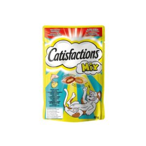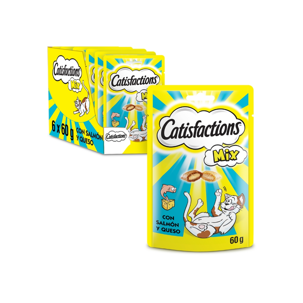 Los gatos se vuelven locos por el irresistible sabor de los premios Catisfactions. Deliciosamente crujientes por fuera y suaves por dentro; los gatos no pueden resistirse al delicioso sabor de Catisfactions. Así que, agita la bolsita y observa como tu gato viene corriendo.
