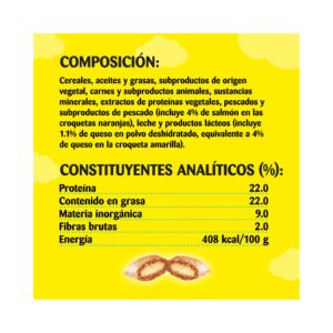 carnes y subproductos animales, cereales, aceites y grasas, subproductos de origen vegetal, extractos de proteínas vegetales, sustancias minerales, pescados y subproductos de pescado (incluye 4% de salmón en las croquetas naranjas), leche y productos lácteos (incluye 4% de queso en la croqueta amarilla). Constituyentes analíticos (%): proteína: 32; contenido en grasa: 25; materia inorgánica: 9; fibras brutas: 1.7; energía: 438 kcal/100g. . Aditivos por kg: Antioxidantes y Colorantes; Aditivos nutricionales: Vitamina A: 6460 UI, Vitamina B₁: 9.9 mg, Vitamina B₂: 16.9 mg, Vitamina B₆: 4.4 mg, Vitamina D₃: 713 UI, Vitamina E (alfa-tocoferoles): 64.8 mg, Sulfato cúprico pentahidratado: 26.7 mg, Sulfato de manganeso monohidratado: 43.4 mg, Yodato de potasio: 2.2 mg, Sulfato de zinc monohidratado: 193 mg.