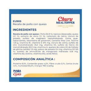 - Elaborado con pollo (32,9 %) y queso (2,1 %)
