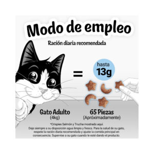 - La cantidad diaria para un gato adulto de 4kg es 13 gr aprox. 35 piezas.