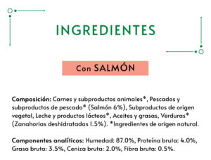 Una receta cuidadosamente elaborada con salmón y un toque de zanahoria para una delicada y sabrosa golosina que tu gato saboreará con placer.