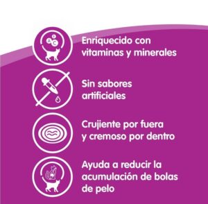 - Deliciosos premios para gatos con doble textura: una capa exterior crujiente y un relleno blando e irresistible.