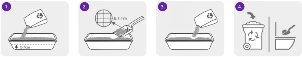 - La forma especial de los gránulos reduce la adherencia al pelaje y las patas, lo que reduce significativamente la cantidad de arena que debe sacarse de la bandeja de arena.